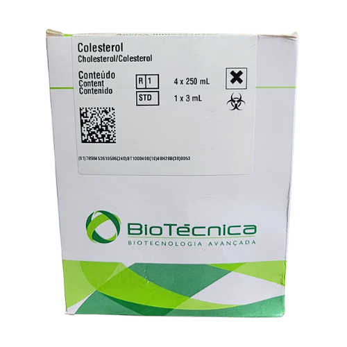 O Kit Colesterol Biotécnica 4x250mL é uma solução de alta performance desenvolvida para a determinação quantitativa do colesterol em amostras de soro. Utilizando o consagrado Método Enzimático – Trinder, este kit oferece resultados com excelente linearidade e precisão, fundamentais para o diagnóstico e monitoramento do perfil lipídico na rotina laboratorial.